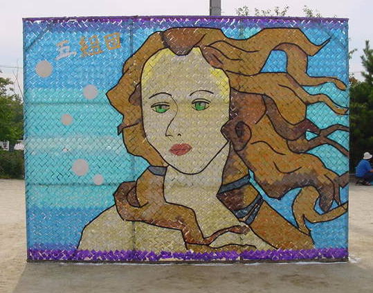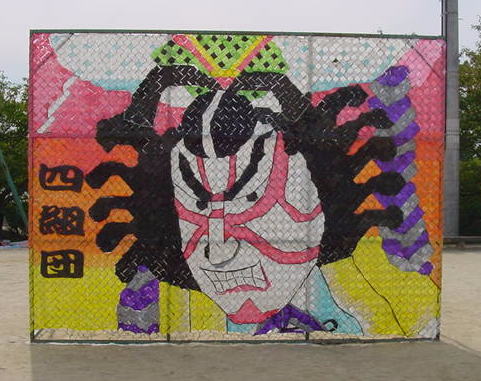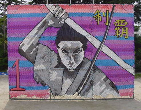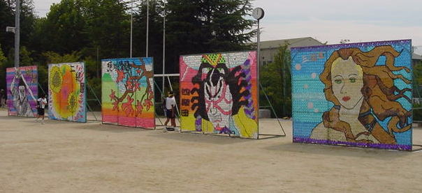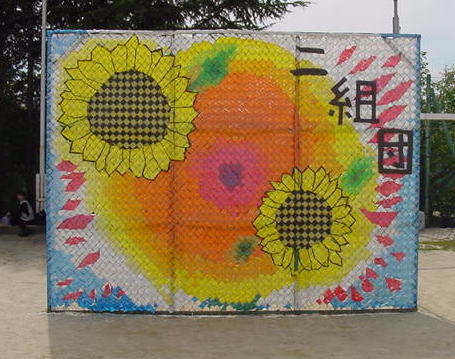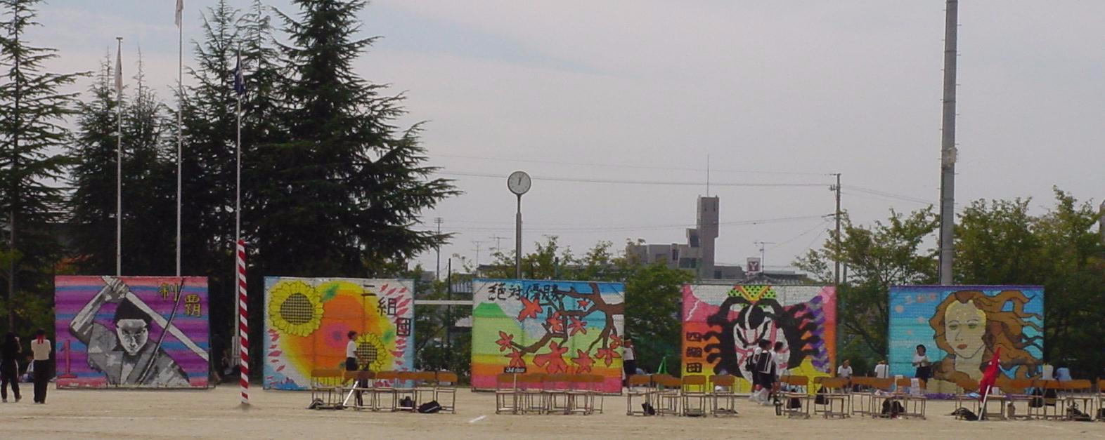 | フェンス壁画というのは、移動式のフェンスにタフロープという着色テープを巻きつけ、壁画を作るもので美里中開校時から続いた伝統のイベントです。体育祭の時には、グラウンドの周りを囲むように飾られました。1クラス1枚ずつ制作され、2年生、3年生になるとともにデザイン、制作技術も向上されました。 しかし、2001年、2002年には、3学年で1つの作品を制作するようになり、2003年からは、学校週5日制や制作時にごみが大量に出るとの理由から廃止されるそうです。在学中に3年とも中心になってやってきた者からすると大変寂しい限りです。 そこで校長に「今までの作品の写真が残っていれば是非作品集を作って欲しい」と提案しました。実現されればいいのですが。 |